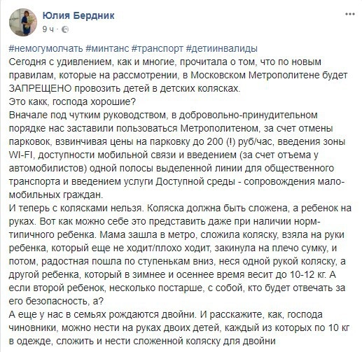Она отметила, что с удивлением узнала о новых правилах метрополитена. Обратила внимание на то, что ранее горожан «в добровольно-принудительном порядке заставили пользоваться метрополитеном, за счет отмены парковок, взвинчивая цены на парковку до 200 (!) руб./час», а теперь хотят запретить матерям перевозить детей в колясках в подземке.