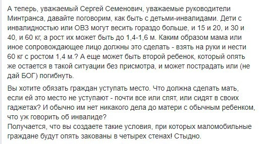 Женщина добавила, что в случае одобрения приказа Минтранса особенно тяжело придется мамам детей-инвалидов. Ведь такие дети могут быть уже большими, но все еще неспособными передвигаться самостоятельно. По ее словам, руководство Минтранса создает такие условия, при которых маломобильные дети вынуждены сидеть дома «в четырех стенах».