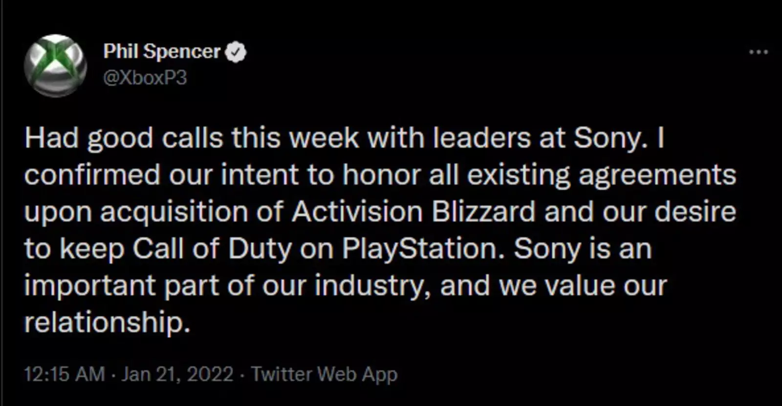 «На этой неделе у нас были хорошие звонки с руководителями Sony. Я подтвердил наше намерение соблюдать все существующие соглашения после приобретения Activision Blizzard и наше желание сохранить Call of Duty на PlayStation. Sony — важная часть нашей индустрии, и мы дорожим нашими отношениями», написал руководитель в Твиттере.