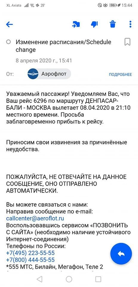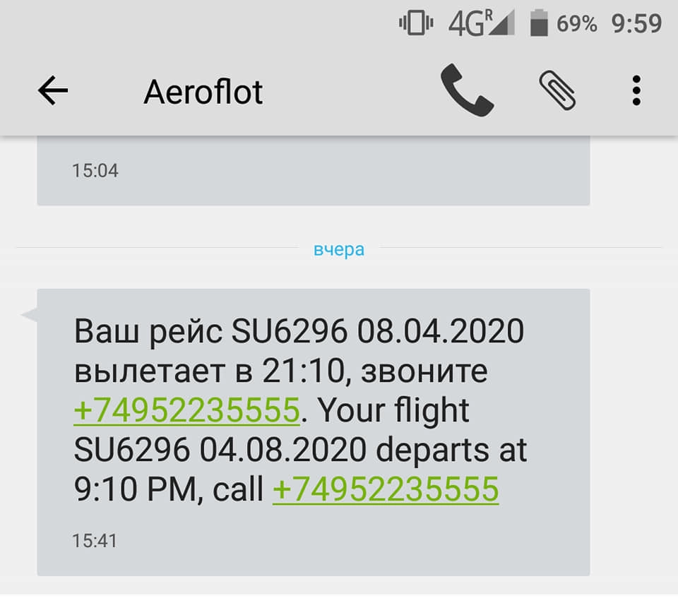 15:41 — я одновременно получаю смс на российский номер и письмо на почту от Аэрофлота, что мой рейс вылетает ровно через 5 часов 29 минут. До этого никакой информации я не получал, ни СМС, ни писем, ни звонков, телефон был постоянно включён!