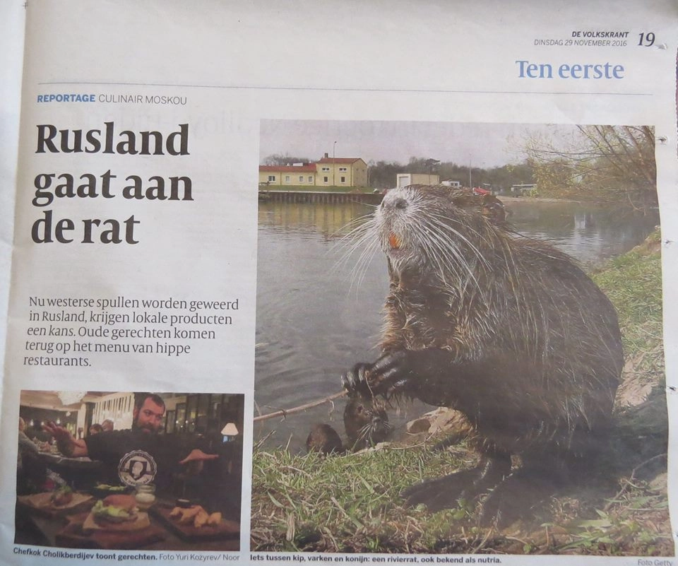 Лонгрид голландских правдорубов, доступный только подписчикам De Volkskrant, рассказывает своей аудитории о том, что российской публике давно сообщили российские медиа: краснодарец Тахир Холикбердиев открыл в Москве бистро, где, помимо всего прочего, подают бургеры из мяса нутрии.