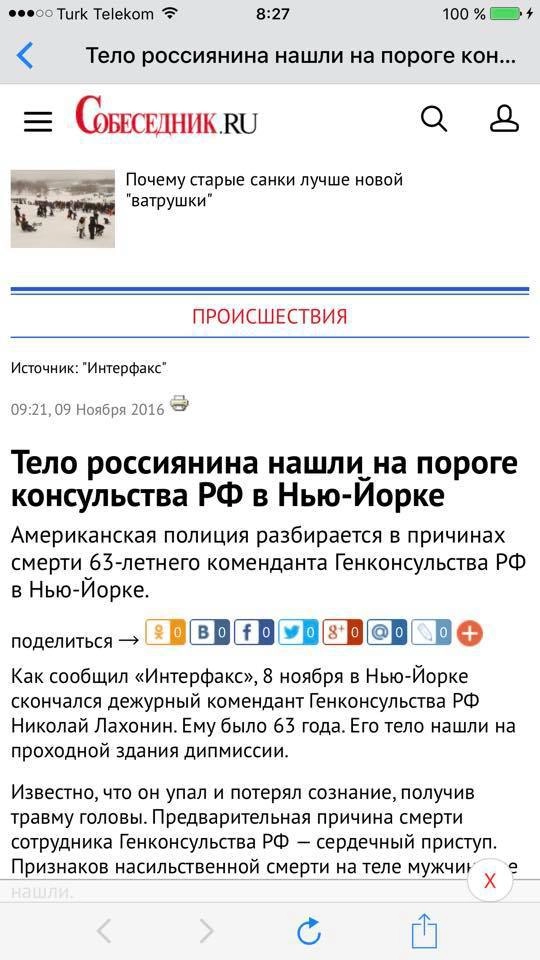 О следующем фейке от «Собеседника» поведала официальный представитель МИД Мария Захарова. Поводом для вброса послужила новость о том, что в Генконсульстве РФ в Нью-Йорке скончался дежурный комендант. Ситуацию подробно комментировал пресс-секретарь Посольства России в США Николай Лахонин.