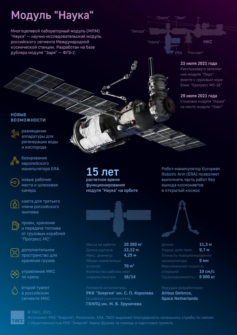 По данным госкорпорации, полет модуля к станции продлится 8 суток, стыковка намечена на 29 июля. Ранее стало известно, что отстыковка транспортного грузового корабля «Прогресс МС-16» вместе со стыковочным отсеком-модулем «Пирс», чьё место на МКС займет модуль «Наука», запланирована на 23 июля.