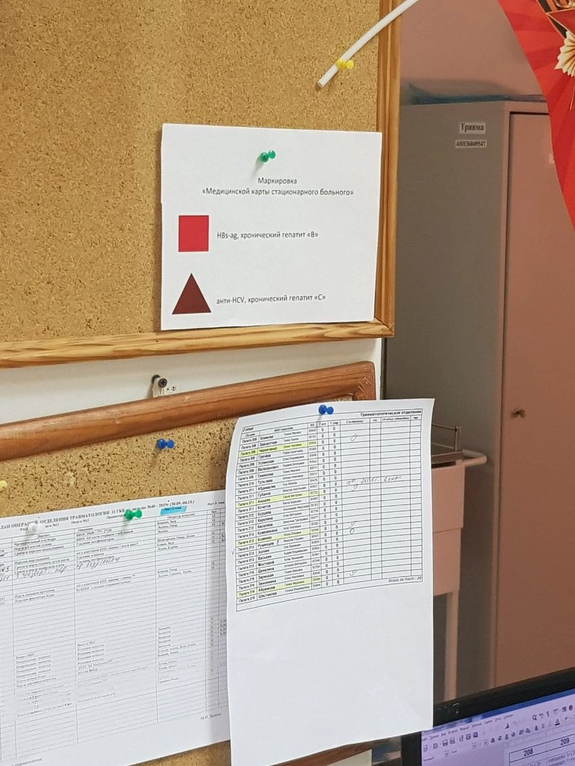 На фото мы видим памятку на информационном стенде, поясняющую сотрудникам больницы значение маркировки. Карты пациентов с хроническим гепатитом В метят красным квадратом, а страдающих хроническим гепатитом С — коричневым треугольником.