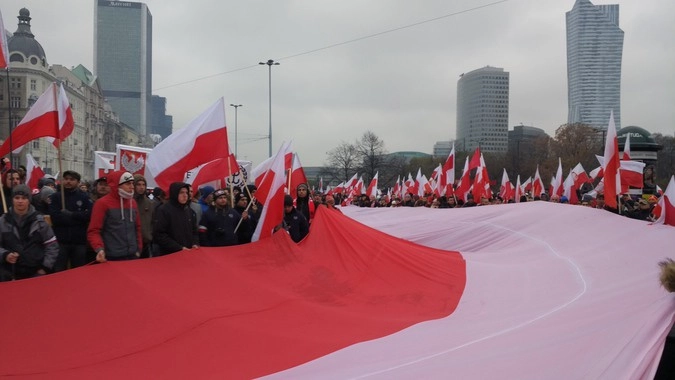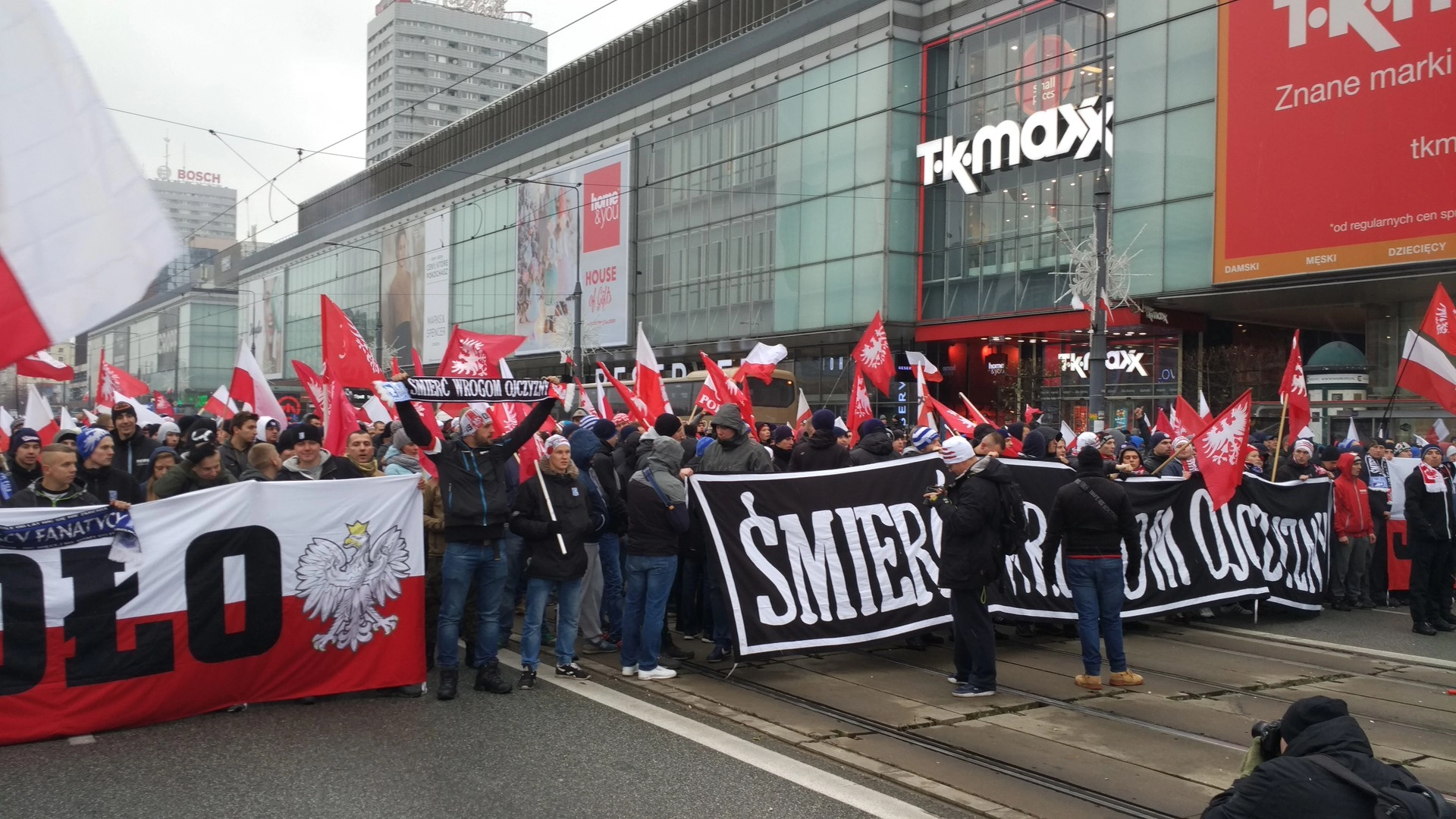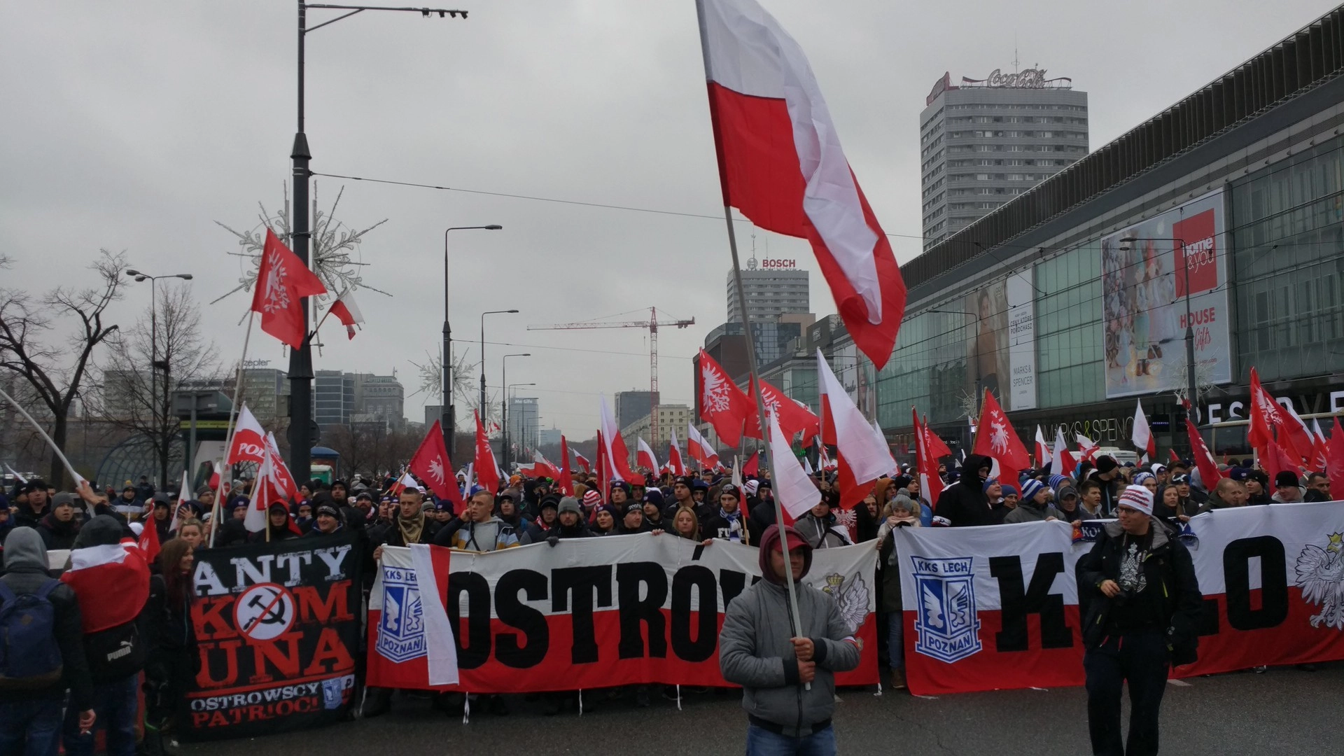 На следующее утро в центр Варшавы стали стекаться людские потоки: пенсионеры с ленточками, модно одетая молодежь с красно-белыми повязками, околофутбольщики и скинхеды с флагами и представители среднего класса.