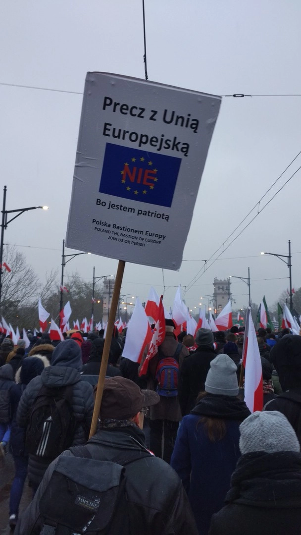 Надо сказать, что подавляющее число польских националистов считают себя евроскептиками. То там, то сям слышались антисоюзные лозунги, некоторые держали в руках соответствующие транспаранты.