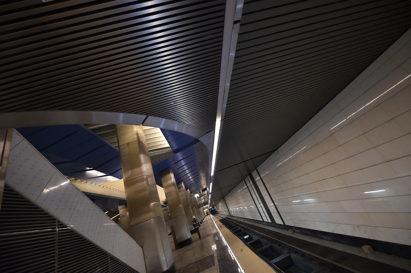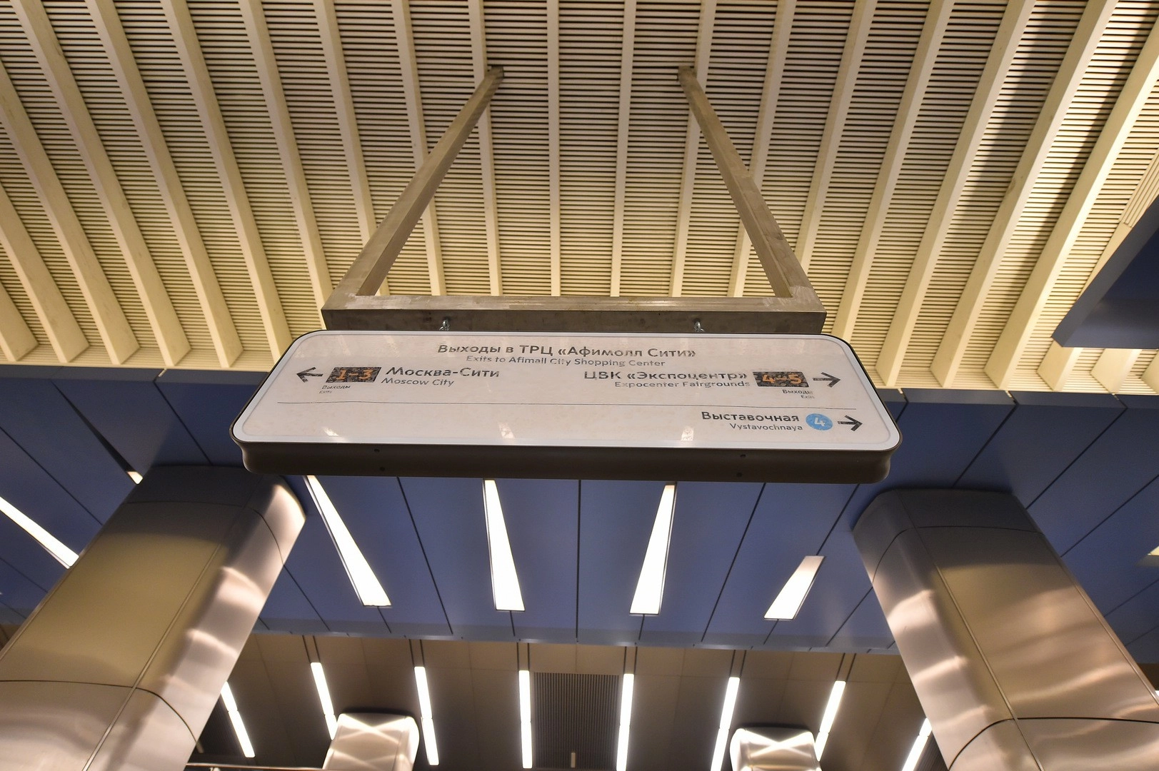 Начнем виртуальную экскурсию по новым станциям московской подземки с «Делового центра». Станция расположена в центре «Москва-Сити» и является «близнецом» одноименной станции Калининско-Солнцевской линии: обе станции объединяет общий дизайн.