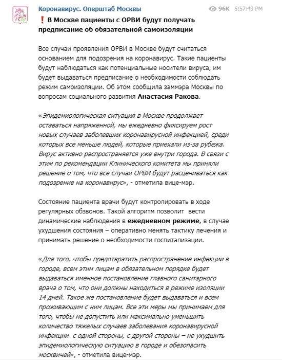 «Эпидемиологическая ситуация в Москве продолжает оставаться напряженной, мы ежедневно фиксируем рост новых случаев заболевших коронавирусной инфекцией, среди которых все меньше людей, которые приехали из-за рубежа. Вирус активно распространяется уже внутри города. В связи с этим по рекомендации Клинического комитета мы приняли решение о том, что все случаи ОРВИ будут расцениваться как подозрение на коронавирус», — цитирует слова вице-мэр оперативный штаб Москвы по борьбе с эпидемией.