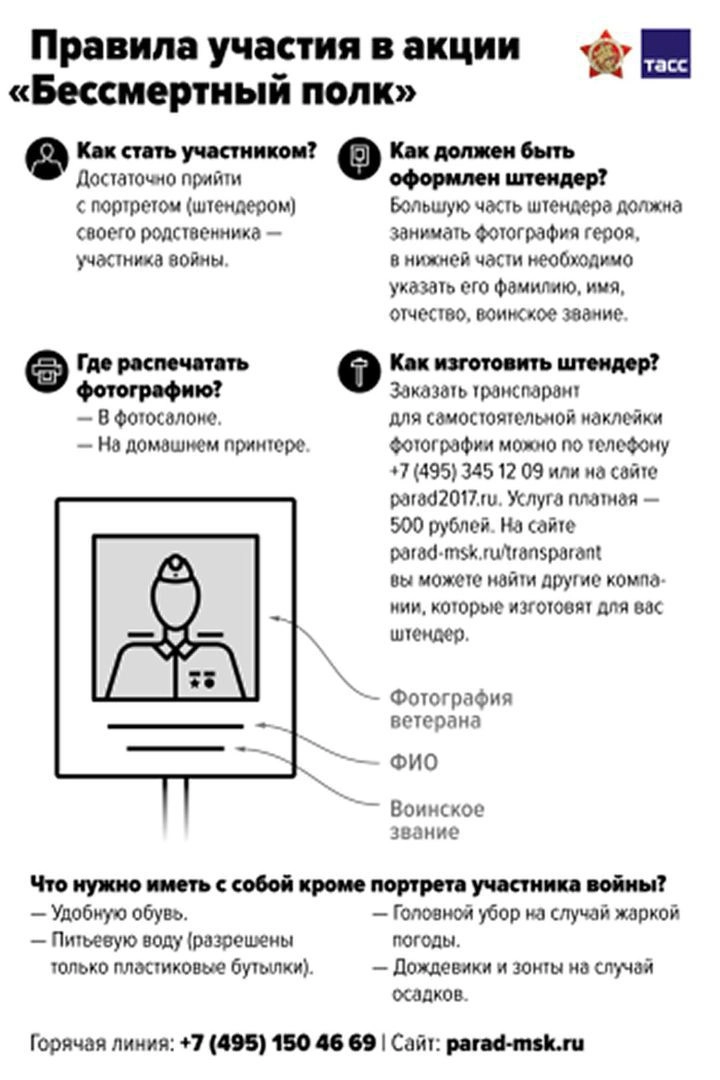 В столичном шествии примут участие более 700 тысяч жителей и гостей столицы. Люди пройдут по Ленинградскому проспекту, улицам 1-й Тверской-Ямской и Тверской, через Охотный ряд, Манежную и Красную площади. Синоптики предупреждают, что в Москве 9 мая будет достаточно холодно. Поэтому участникам «Бессмертного полка» рекомендуется одеться потеплее, не забыв про перчатки и шапки.
