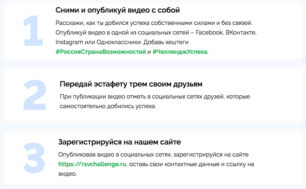 Чтобы присоединиться ко всероссийской эстафете достаточно опубликовать в соцсетях «Вконтакте», Facebook, «Одноклассники» или Instagram минутный видеоролик о своей истории успеха, сопроводить его хештегами #РоссияСтранаВозможностей и #ЧелленджУспеха — и «бросить вызов» трем своим друзьям. Инициаторы челленджа подчеркивают: передавать эстафету нужно именно тем, кто смог добиться успеха своими силами — без «полезных связей».
