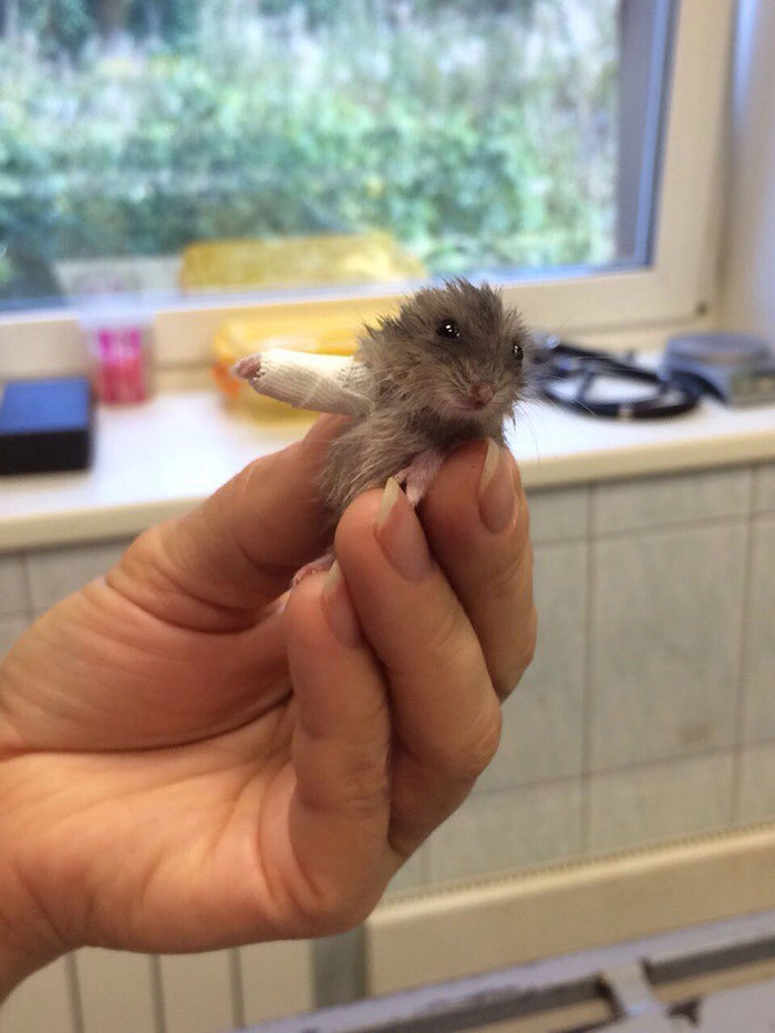Маленький хомяк сломал лапку. Теперь ему предстоит провести в таком виде некоторое время