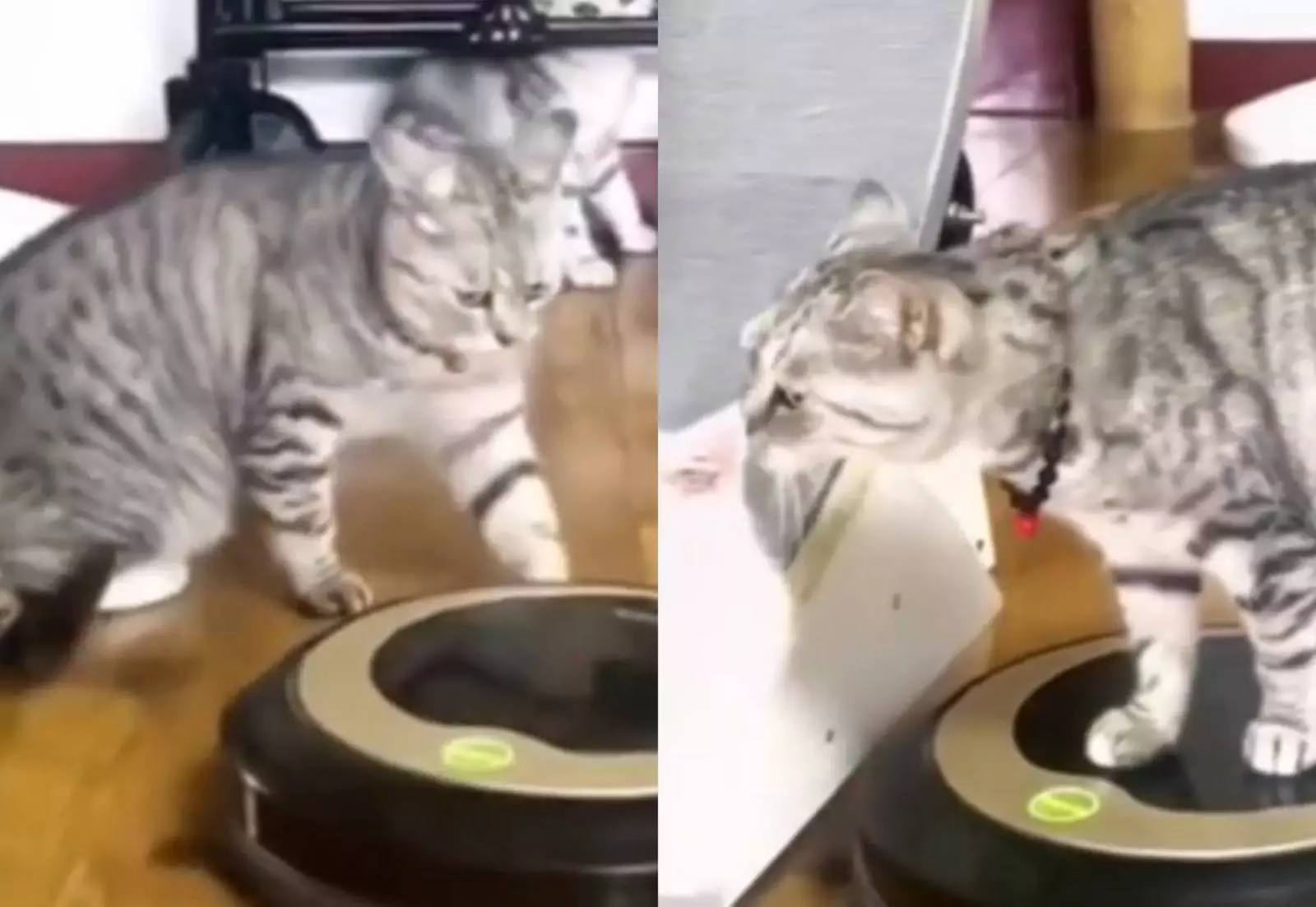 «Вставай, убирайся»: кот воспользовался роботом-пылесосом, чтобы отчитать подругу