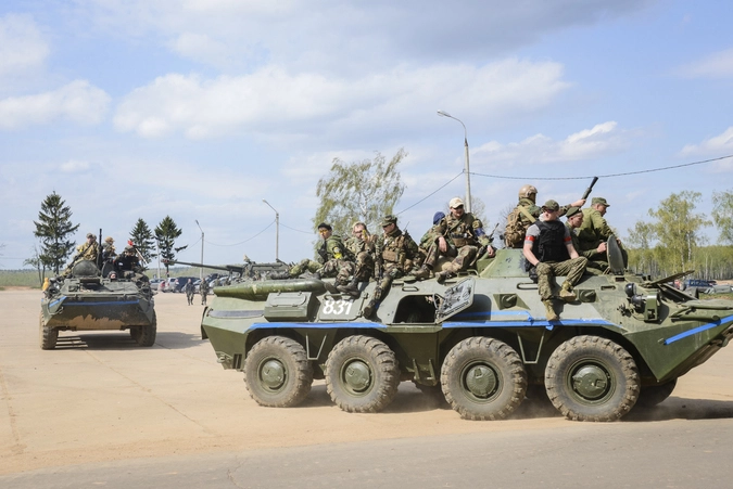 Мужчины, немного женщин и даже какой-то мальчик с горящими глазами забираются на крышу и внутрь бронетранспортеров.