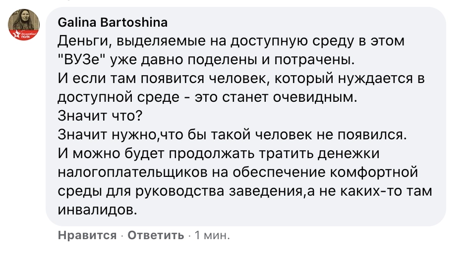 Это явное недопонимание. У Татьяны Полововой сейчас очень сложная жизненная ситуация, у нее очень болен отец. И она, видимо, как-то неуравновешенно, взвинченно это ответила. Она имела ввиду, что у нас в университете нет бюджетных мест в принципе. Просто во многих университетах для людей с ограниченными возможностями здоровья есть специальные бюджетные места, на которые они могут поступить вне конкурса. Мы не можем этого предложить, — прокомментировал ситуацию «Ридусу» глава пресс-службы вуза Сергей Кашкадамов.