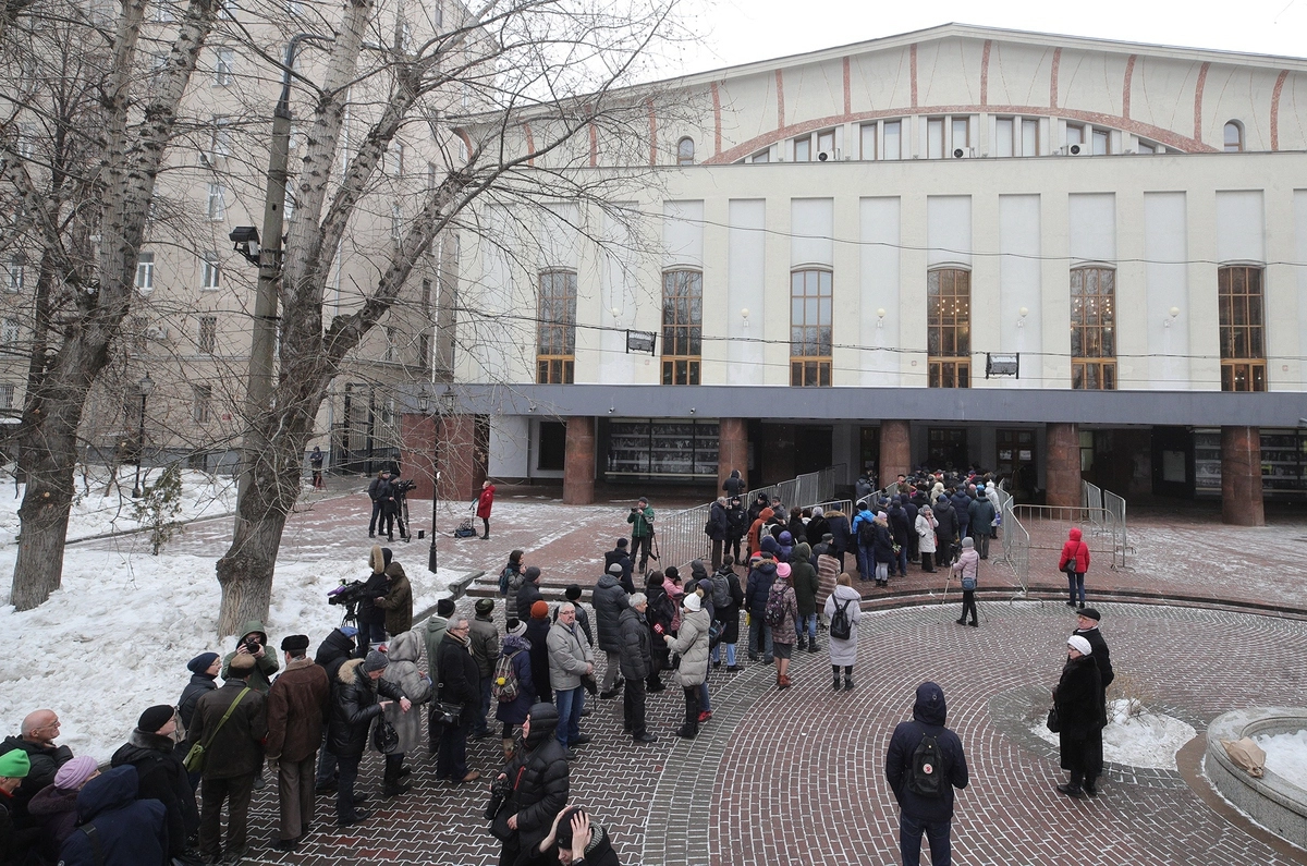 Генеральный директор Первого канала Константин Эрнст (в центре) перед началом церемонии прощания с актером Сергеем Юрским у Театра имени Моссовета.