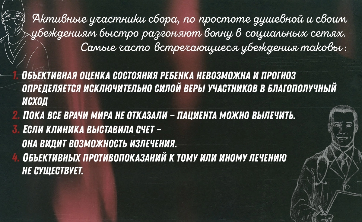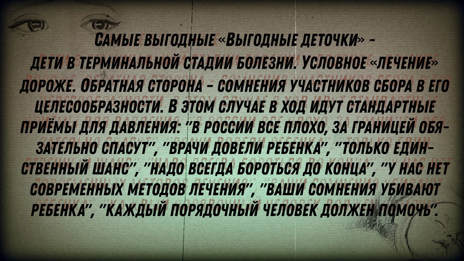 Вокруг любого такого сбора крутится достаточное количество людей, для которых это заработок на жизнь. Так что не факт, что у мамы есть прямой доступ к счетам, открытым на нее. И что там деньги вообще до сих пор лежат. Родителям в таких сборах какая-то часть денег достается всегда, для сборщиков это гарантия, что родители не поднимут шум, будучи „замазанными“. Сборщики сами и подбивают родителей на траты на погашение ипотек-кредитов прямо во время сбора, чтобы иметь рычаг влияния, — рассказывает Светлана о самом распространенном варианте.