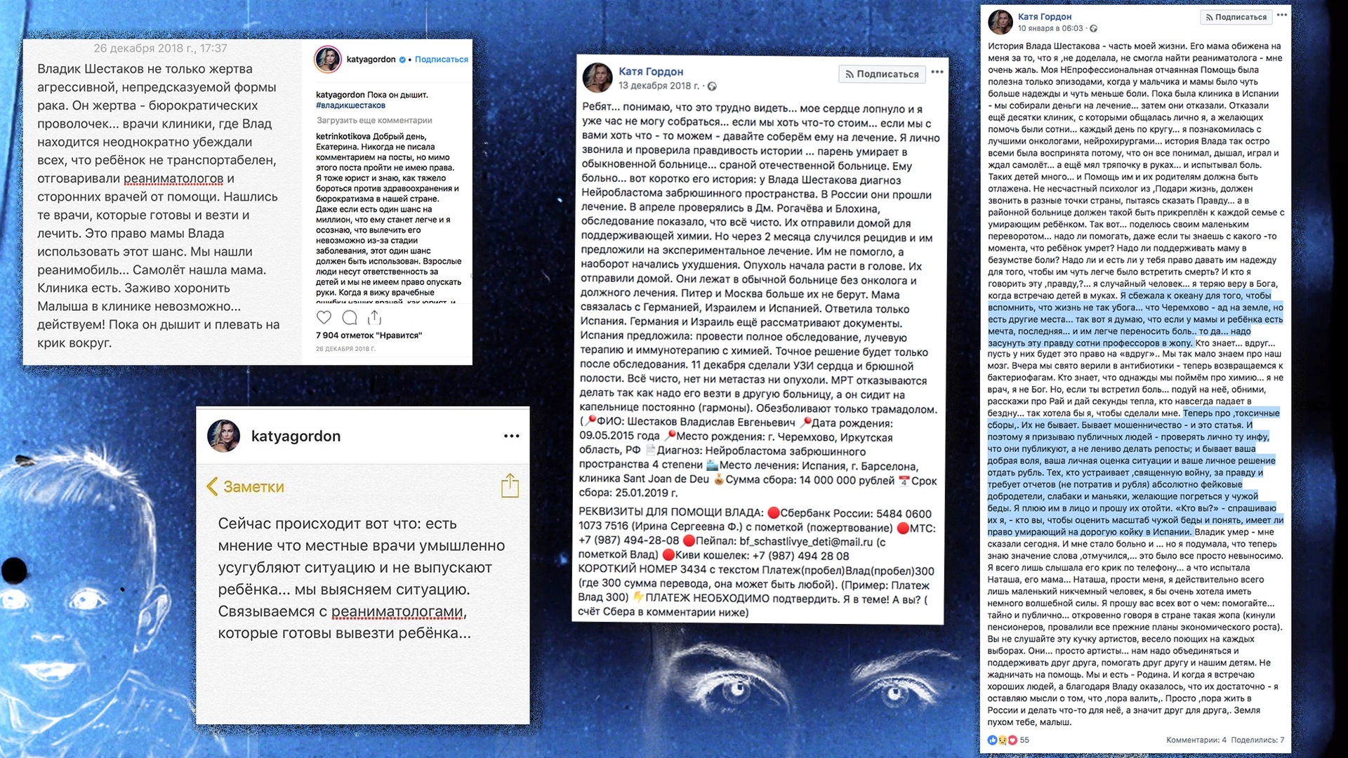 Свою долю пиара на Владе Шестакове получила и правозащитница Катя Гордон. В ее постах в социальных сетях можно найти и обвинения врачей из Черемхово в «умышленном усугублении ситуации», и эпитеты вроде «сраной отечественной больницы». Уже после того как Влад умер, на страничке Гордон появились и вовсе весьма любопытные заявления вроде «засунуть правду сотни профессоров в *опу», «токсичных сборов не бывает» и так далее.