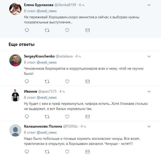 Тем не менее новость о каре для Хорошавина вместо одобрения вызвала скорее сомнения и подозрения в том, что он не «высидит» положенный судом срок. «После выборов будет амнистия», — убежденно пишут и в социальных сетях, и в комментариях к публикациям на сайтах СМИ.