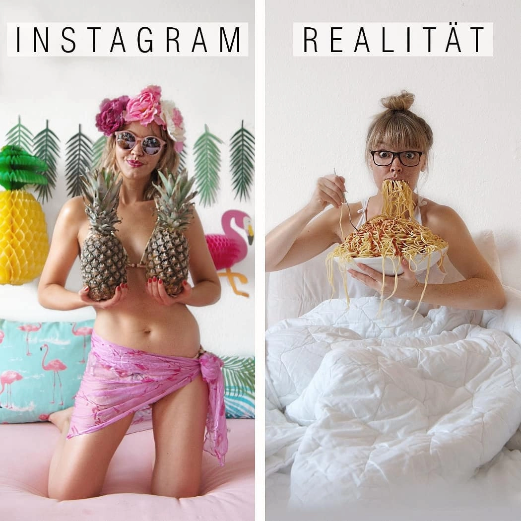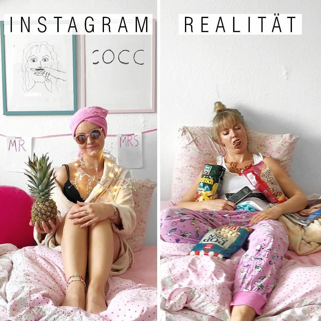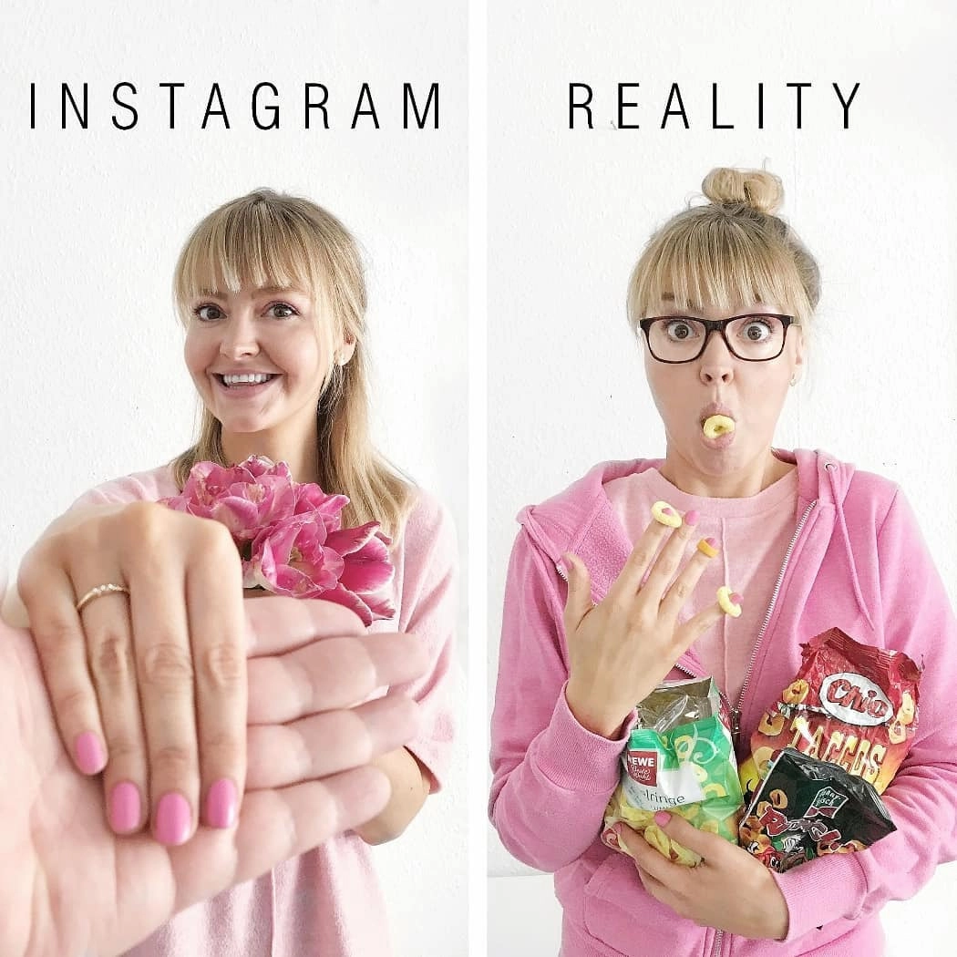 Немецкая блогерша Джеральдина Уэст (Geraldine West) из Кёльна придумала на эту тему целый проект. Она создаёт фотографии из серии «Инстаграм и реальность», которыми показывает, как отличается красивая картинка от повседневной жизни. С помощью этой идеи девушка собрала уже почти 18 тысяч подписчиков на свою страничку. Правда критики отмечают, что так называемые реальные снимки Джеральдины тоже слишком постановочные. Давайте посмотрим.