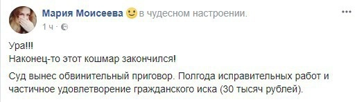 Ранее пострадавшая Мария Моисеева делилась, что весной прошлого года она вела детей в школу, переходила с ними дорогу по нерегулируемому пешеходному переходу. Когда семья дошла до середины дороги, мимо пронеслась черная иномарка. Мать едва успела отдернуть сына от автомобиля, при этом возмущенная женщина «хлопнула ладонью по заднему бамперу».