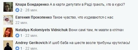 «Вместо систематической работы и лоббирования правильных законопроектов — блокировка и столкновения с ментами. Вместо юридической работы — покидания зала парламента. Вместо работы на местах — пиар на телеэфирах. Но что? Правильно. Все равно они пройдут в следующую Раду и будут кормить всех г*****м. Потому что люди проголосуют», написал один из блогеров.