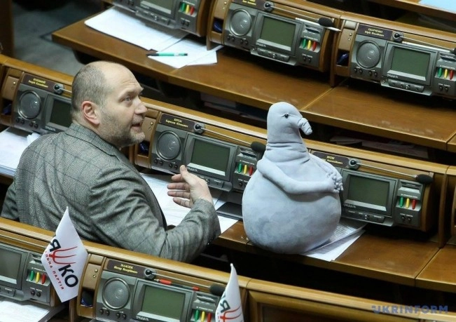Сначала депутат посадил игрушку на место народного депутата Дмитрия Яроша (одного из главных-прогульщиков), а затем Ждун начал перемещаться по залу и оценившие его появление депутаты даже позволили тому «высказаться», посадив за трибуну.