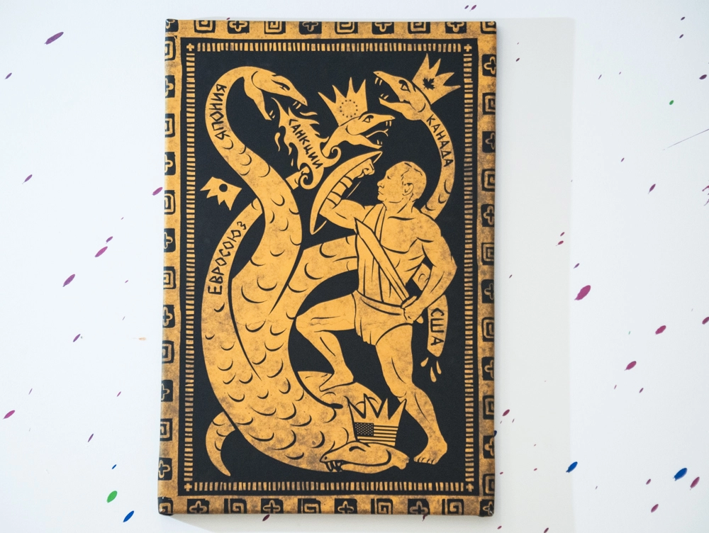 - Убийство Лернейской гидры — Ответ на санкции. Лернейская гидра была змееподобным чудовищем с ядовитым дыханием, у которого вместо отрубленных голов вырастали новые. Поэтому Геракл не просто рубил ей головы, но и прижигал их. «Санкции Запада против нашей страны в ответ на попытку остановить преступения киевской хунты можно победить только симметричными мерами. Введение Путиным моратория на поставки сельхозпродукции из стран, которые выставили санкции против России или их поддержали, нанесло удар политике односторонней изоляции России», — объясняют свое видение мифологии художники, скромно скрывшие имена. Собственно, не стал скрываться лишь администратор группы в Facebook, насчитывающей 250 тысяч подписчиков, участники которой, собственно, и скинулись на проект. Да, и то, не стал скрываться, лишь потому как Михаилу Антонову, одному из авторов «ЭкоРидуса», известного своим арт-хулиганством, спрятаться от бдительного ока сетвой аудитории все равно практически не возможно.