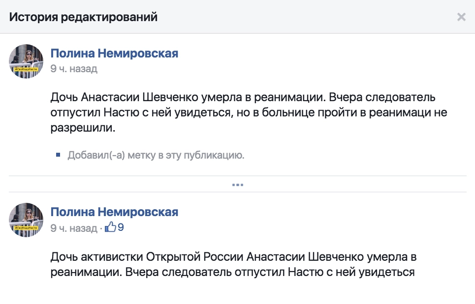 Следите за руками, как сейчас будет делаться «кровавый режим». Оная Анастасия Шевченко отдала свою больную дочь в интернат — это раз. (UPDATE: на суде она сказала, что отдать ребенка в психо-неврологический диспансер ее заставили органы опеки). Следователь отпустил ее в больницу к дочери до вечера 1 февраля — это два. Девочка была тяжело больна и, судя по словам врачей, обречена — это три. Но Гудков уже пишет про убийство. Лично Путин убил. А что мать оставила больного ребенка ради общественного активизма — это неважно. Как и то, что Ходорковский мог бы помочь девочке. Но не помог.