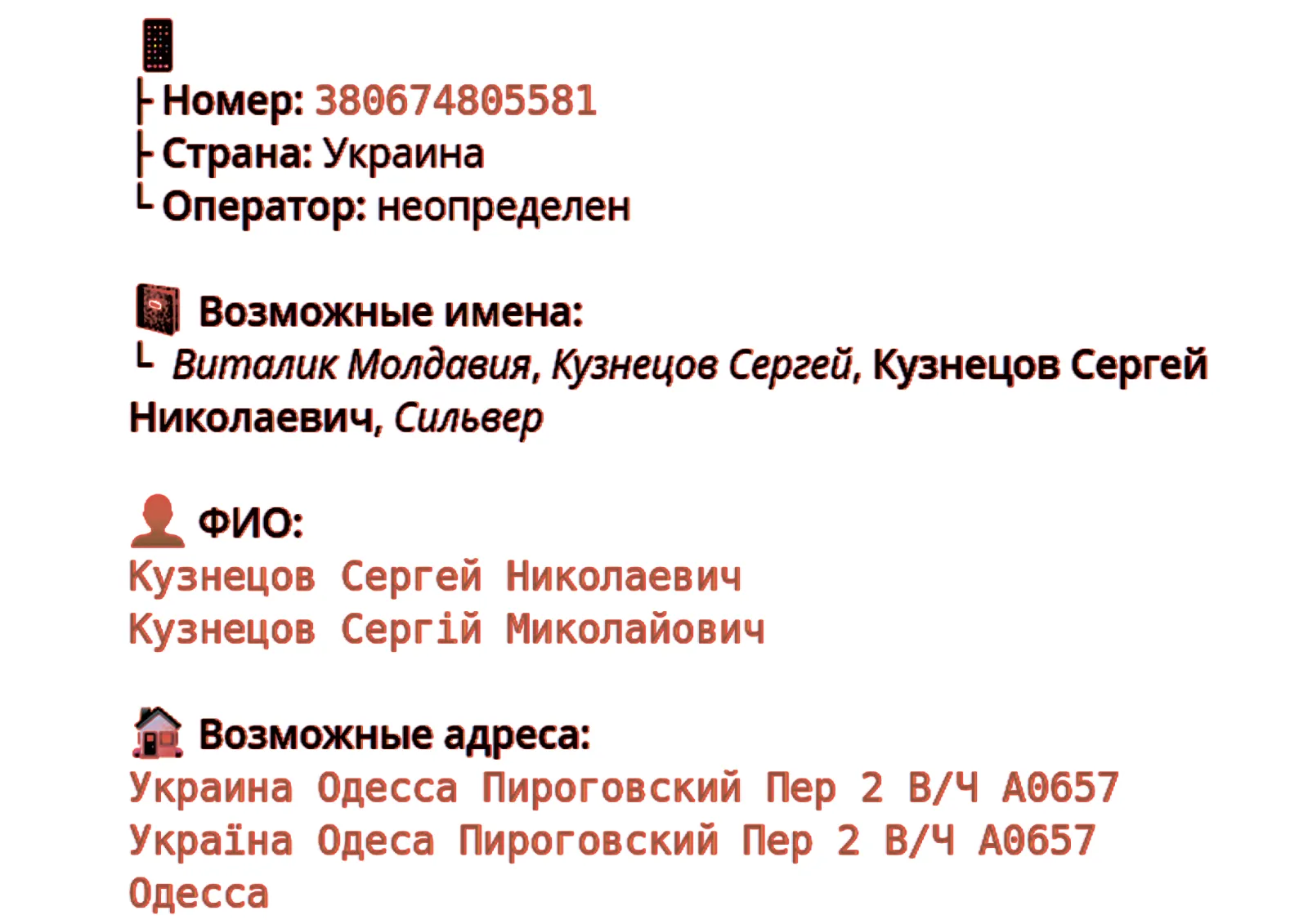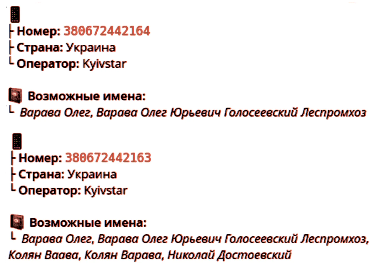 Было установлено, что в базах данных Червинский Р. и Варава О. записаны у других абонентов в телефонных книгах мобильных устройств под тегом: «Голосеевский леспромхоз», в свою очередь Кузнецов С. записан под тегом: «в.ч. А 0657». Стоит отметить, что ряд военнослужащих указанной войсковой части также записан под тегом «Голосеевский леспромхоз».