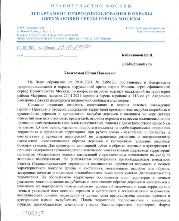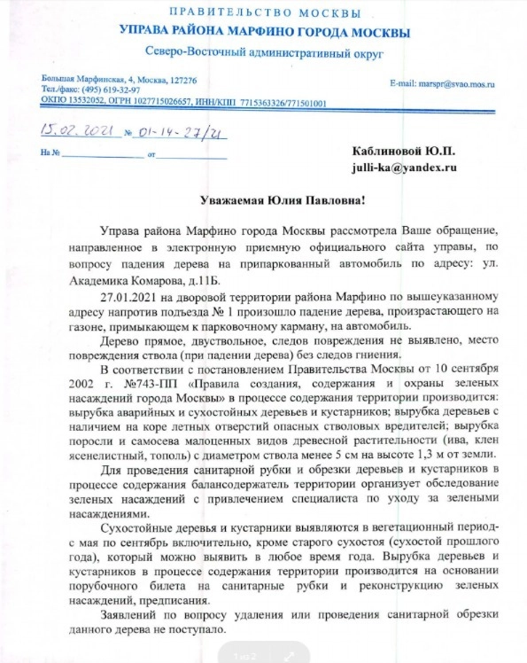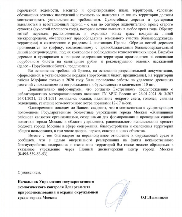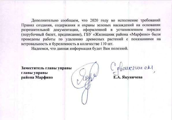 Представители ГБУ «Жилищник», а также Департамента природопользования, Управы района Марфино, префектуры СВАО практически единогласно, буквально с разницей в запятых, сообщили, что никакой вины за собственником дерева нет. Уход за зелеными насаждениями осуществляется, мониторинги проводятся регулярно, как и устранение выявленных проблем. Обращения в мэрию с просьбой разобраться с отписками районных и окружных структур привели лишь к получению новой порции отпечатанных «под копирку» ранее полученных ответов.