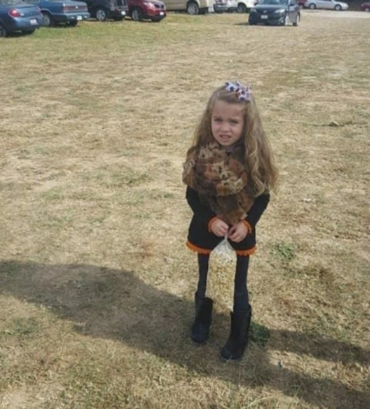 На фото изображена маленькая девочка, которая стоит на выжженной солнцем траве, на первый взгляд ее ноги выглядят очень странно и болезненно. И лишь со второго или третьего раза становится понятно, что она просто держит в руках пакет попкорна, который очень похож на цвет травы.