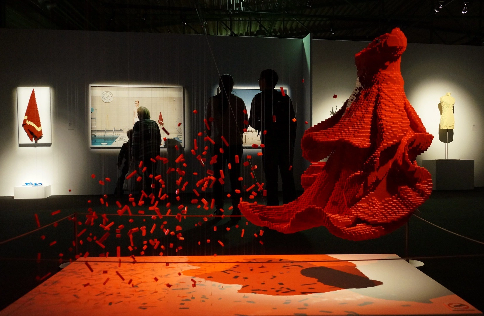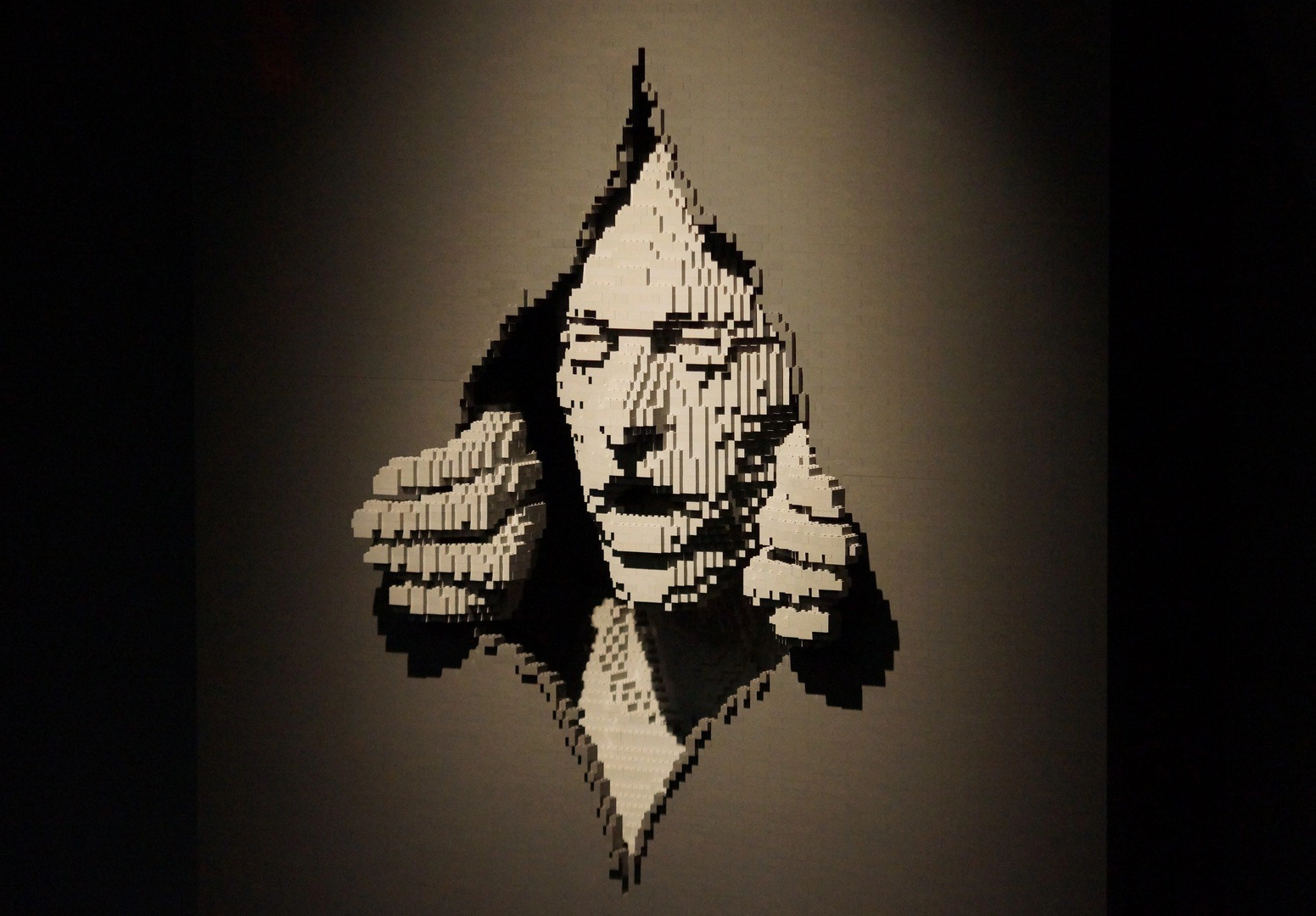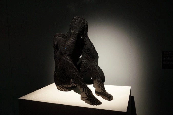 Надо признать, отправляясь на «Искусство Лего», корреспонденты «Ридуса» рассчитывали на несколько иное, нежели то, с чем пришлось столкнуться на выставке. Легендарный конструктор из тысяч разнообразных и ярких пластмассовых кирпичиков, пластинок и других деталей, соединяющихся друг с другом при помощи геометрически правильно расположенных пазов и выступов, ассоциируется, прежде всего, с развивающими детскими игрушками в виде машинок, домиков, космических кораблей и забавных Лего-человечков. Однако, всего этого на выставке увидеть практически невозможно. Напротив, выставленные произведения состоят из множества практически одинаковых, как по форме, так и по цвету кубиков. На выставке мало внешнего света, стены окрашены в темные цвета, но все это с лихвой компенсируется предельно точной подсветкой самих фигур, делающей их главными объектами в данном пространстве.
