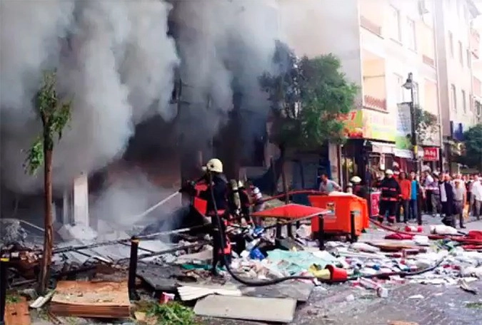Взрыв прогремел возле торгового центра. К месту ЧП прибыли медики и пожарные. Автомобили скорой помощи увозят раненых в больницы. Полиция оцепила район взрыва, который находится возле торгового центра на Истикляле.