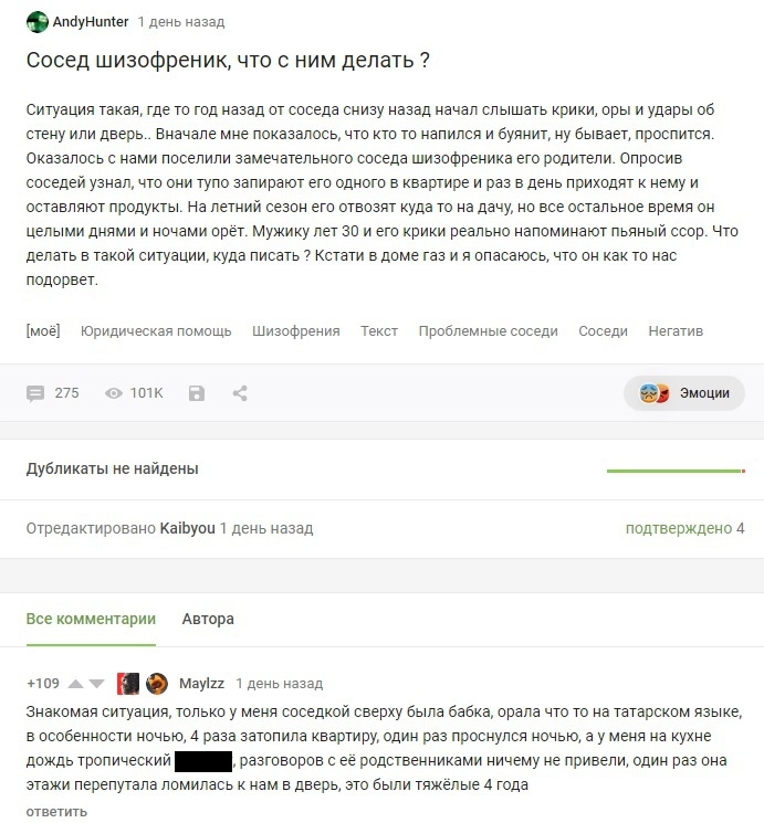 На днях о похожей ситуации писало издание «Версия-Саратов». Житель дома № 21 на улице Крымской поволжского города использовал коврик у соседской двери как туалет, кидал кирпичами в машины у подъезда и занимался телефонным терроризмом — то сообщит, что в соседней квартире заложена мина, то нажалуется в полицию, что там якобы «наркотики фасуют» или «воры в законе убивают детей». Это продолжалось полтора года — в итоге он был госпитализирован в психиатрическую больницу Святой Софии.