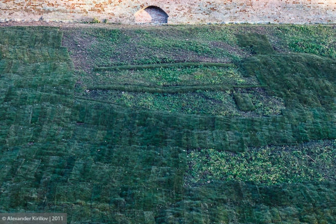 Так укладывается травяное покрытие вдоль стен Кремля в Великом Новгороде.