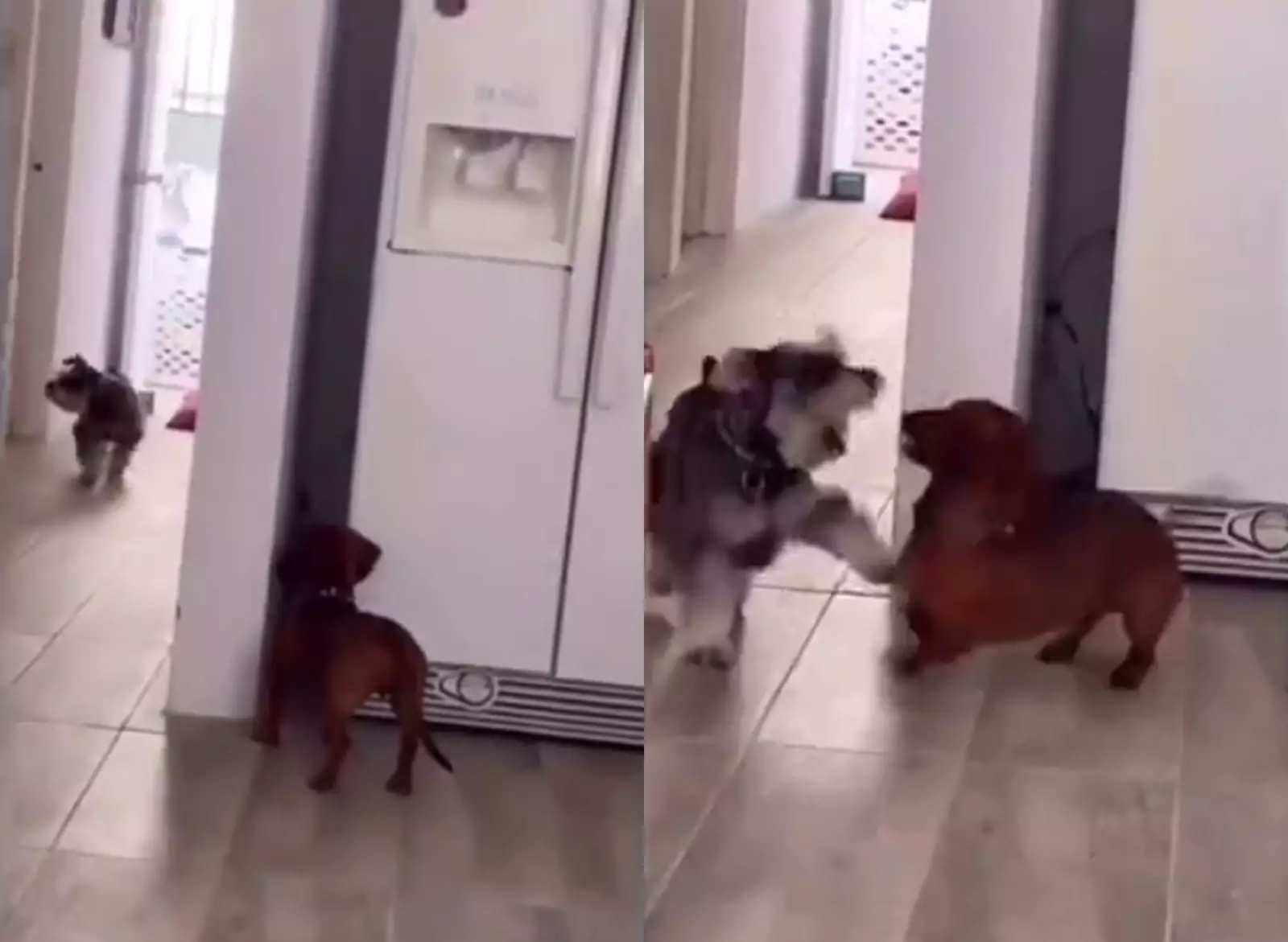 Сначала может показаться, что никакой игры нет, но потом такса начинает периодически выглядывать и прятаться от водящего обратно за стенку. Они очень похожи на пару задорных детишек.