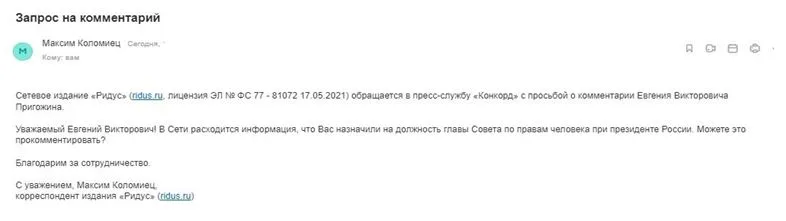 Предприниматель Евгений Пригожин с иронией прокомментировал слухи о своем назначении на пост главы Совета по правам человека при Президенте России. Ответ бизнесмена журналистам издания «Ридус» публикует пресс-служба компании «Конкорд».