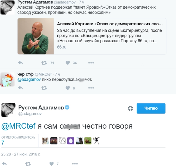 Разумеется, мимо подобных признаний исполнителя популярной версии классических «Генералов песчаных карьеров» и автора недавней и совершенно блестящей «Я офигеваю, мама», не могли пройти либерально настроенные пользователи Рунета, ведомые блогером Рустемом Адагамовым. В Сети Кортнева поспешили окрестить главным «ватником», «иудой» и «врагом интеллигенции»: