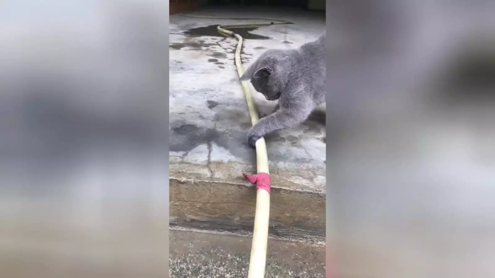 Надо сказать, ему это удалось, одна проблема: как только пушистый сантехник убирал лапу, вода снова начинала бить из шланга.