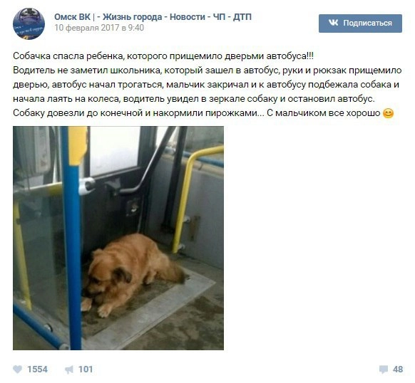 История заключалась в следующем. Мальчика, зашедшего в автобус, зажало дверьми, и это увидела бездомная собака. Пес начал лаять и бросаться под колеса автобуса, привлекая внимание водителя. В итоге шафер освобождал ребенка, а пассажиры угощали пса пирожками.