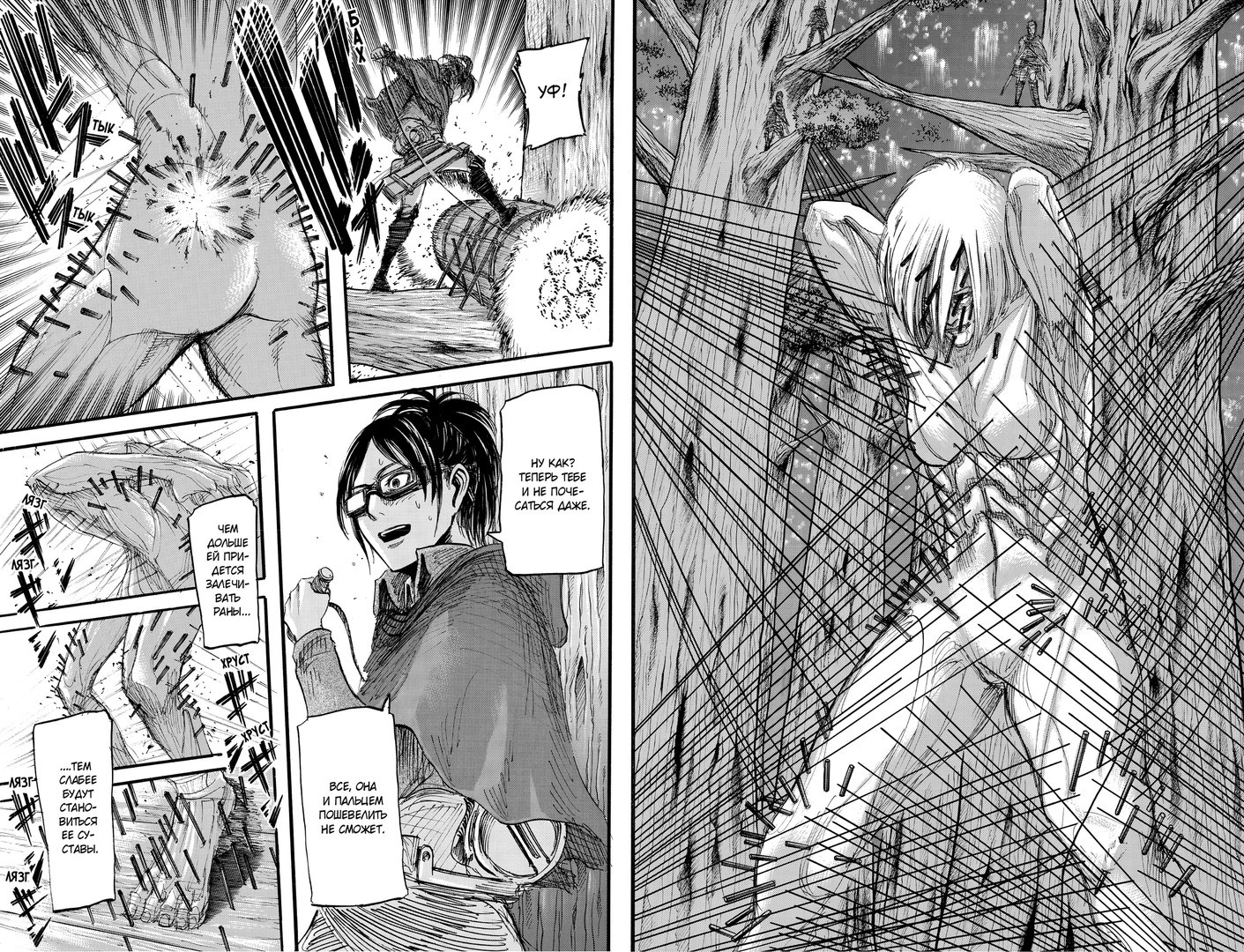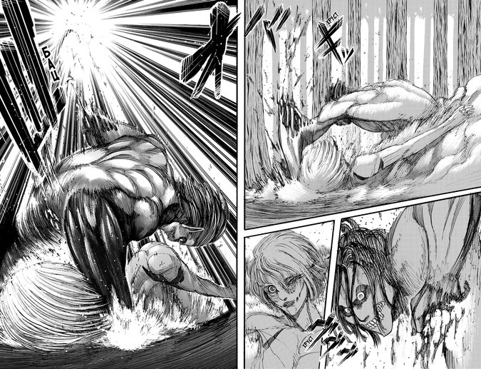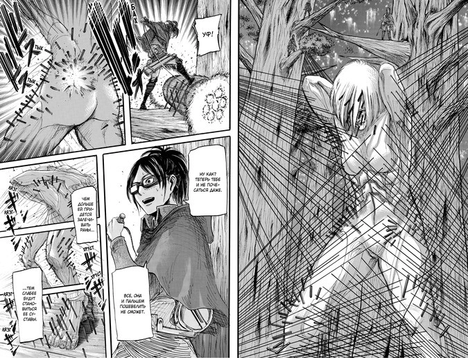 В четвёртом томе «Атаки на титанов» Хадзимэ Исаяма продолжает курс на значительное сужение истории. Здесь по-прежнему то и дело звучат призывы к спасению всего человечества («Ты должен верить, иначе человечество не победит», «Она убегает! Упустим её — и человечеству конец!!!»), но всё-таки очевидно, что автор копает теперь не вширь, а вглубь, одновременно и развивая, и трансформируя свою задумку.