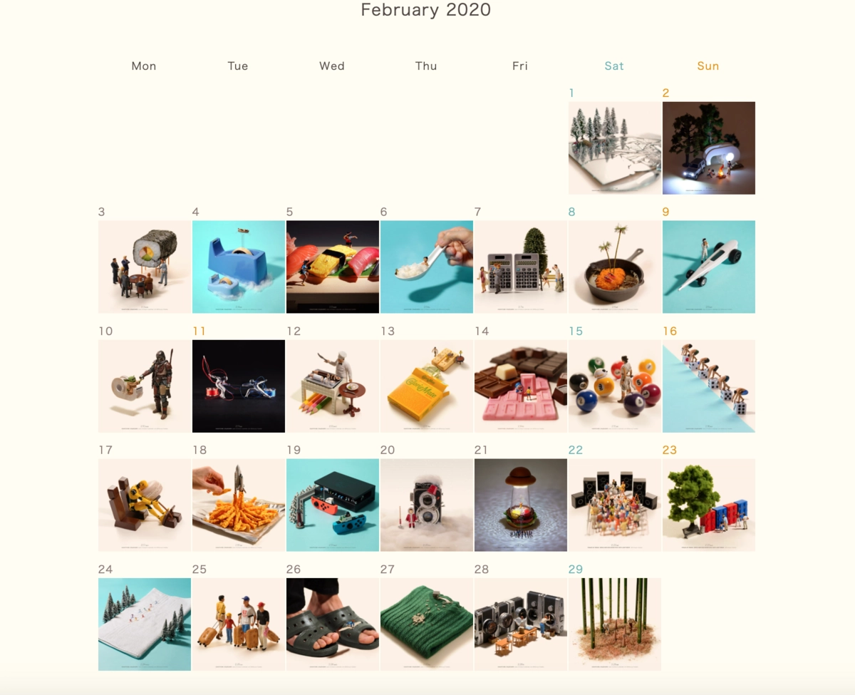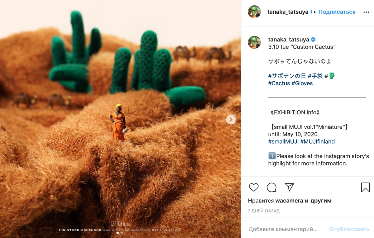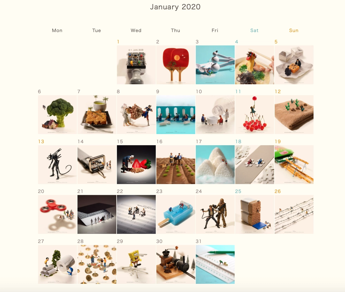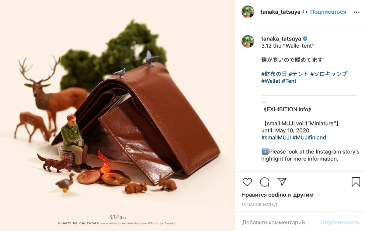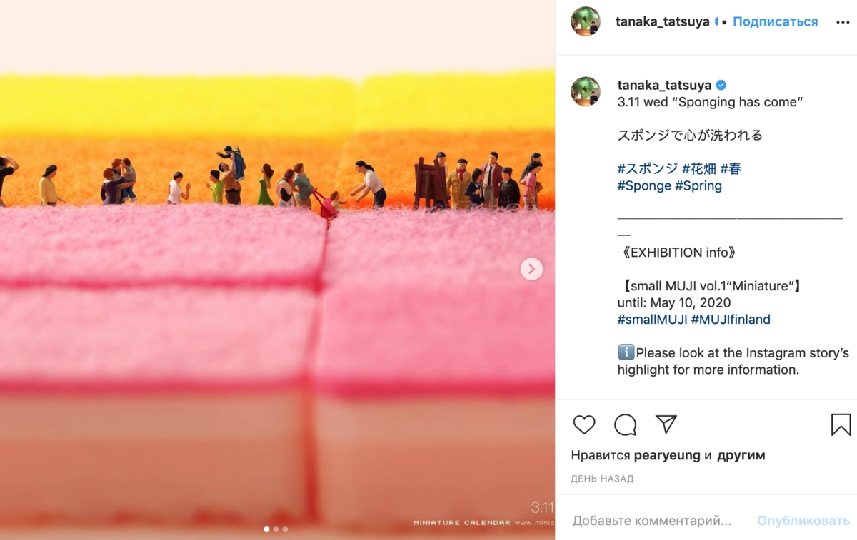 У мастера действительно безграничная фантазия, ведь даже самые обычные и заурядные повседневные предметы он превращает в оригинальные декорации для своих житейских миниатюр. Вот уже несколько лет Танака Тацуя он исправно обновляет онлайн-календарь, каждый день публикуя новые и новые работы. Вести календарь Танака Тацуя начал в апреле 2011 года. И сейчас за его профилем в Instagram следят более 2 миллионов подписчиков!