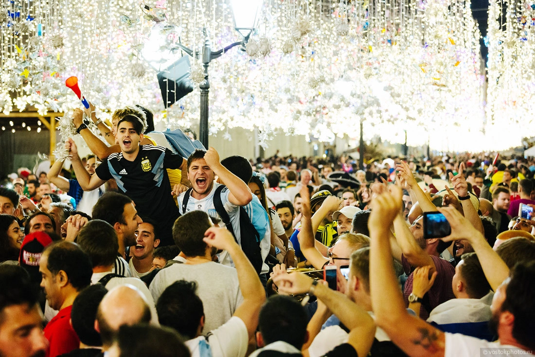 Болельщики выступающих стран то тут, то там собираются в группы и поют свои песни, кричат и веселятся. А остальные их снимают.