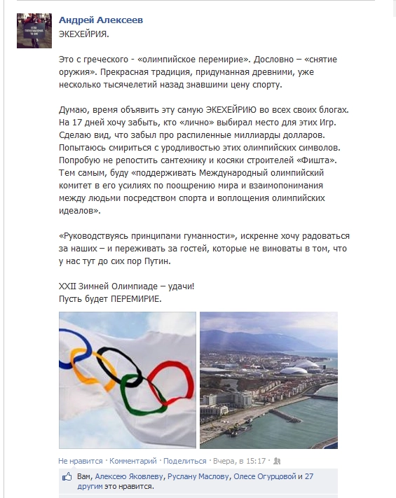"ЭКЕХЕЙРИЯ. Это с греческого - «олимпийское перемирие». Дословно – «снятие оружия». Прекрасная традиция, придуманная древними, уже несколько тысячелетий назад знавшими цену спорту. Думаю, время объявить эту самую ЭКЕХЕЙРИЮ во всех своих блогах." - заявил Алексеев на своей странице.
