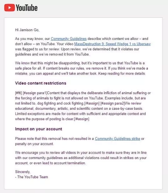 Несколько тематических каналов обратились к администрации видеохостинга с жалобами после того, как некоторые их видео были удалены. Вскоре многие записи были восстановлены, администрация YouTube признала проблему и объяснила ее тем, что роликов было очень много, а в алгоритмах программы произошел сбой.