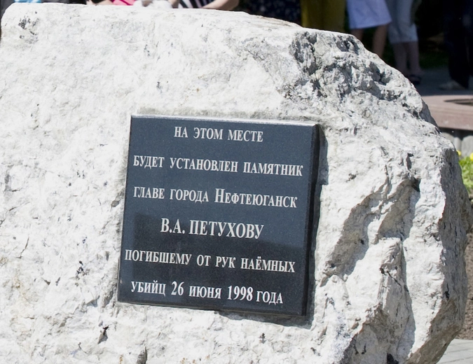 Закладной камень на месте, где впоследствии будет установлен памятник убитому 26 июня 1998 года мэру Нефтеюганска Владимиру Петухову.