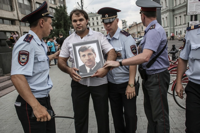 Лидер движения "Россия молодая" Антон Демидов (в центре) с портретом мэра Нефтеюганска Владимира Петухова. Он был задержан за несогласованный пикет на Тверском бульваре, где проходил оппозиционный митинг в честь юбилея Михаила Ходорковского.