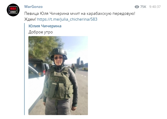 В Telegram-каналах появились сообщения, что рок-звезда Юлия Чичерина попала под обстрел в зоне военных действий в Нагорном Карабахе. Об этом сообщают российские военные корреспонденты, работающие в зоне конфликта.