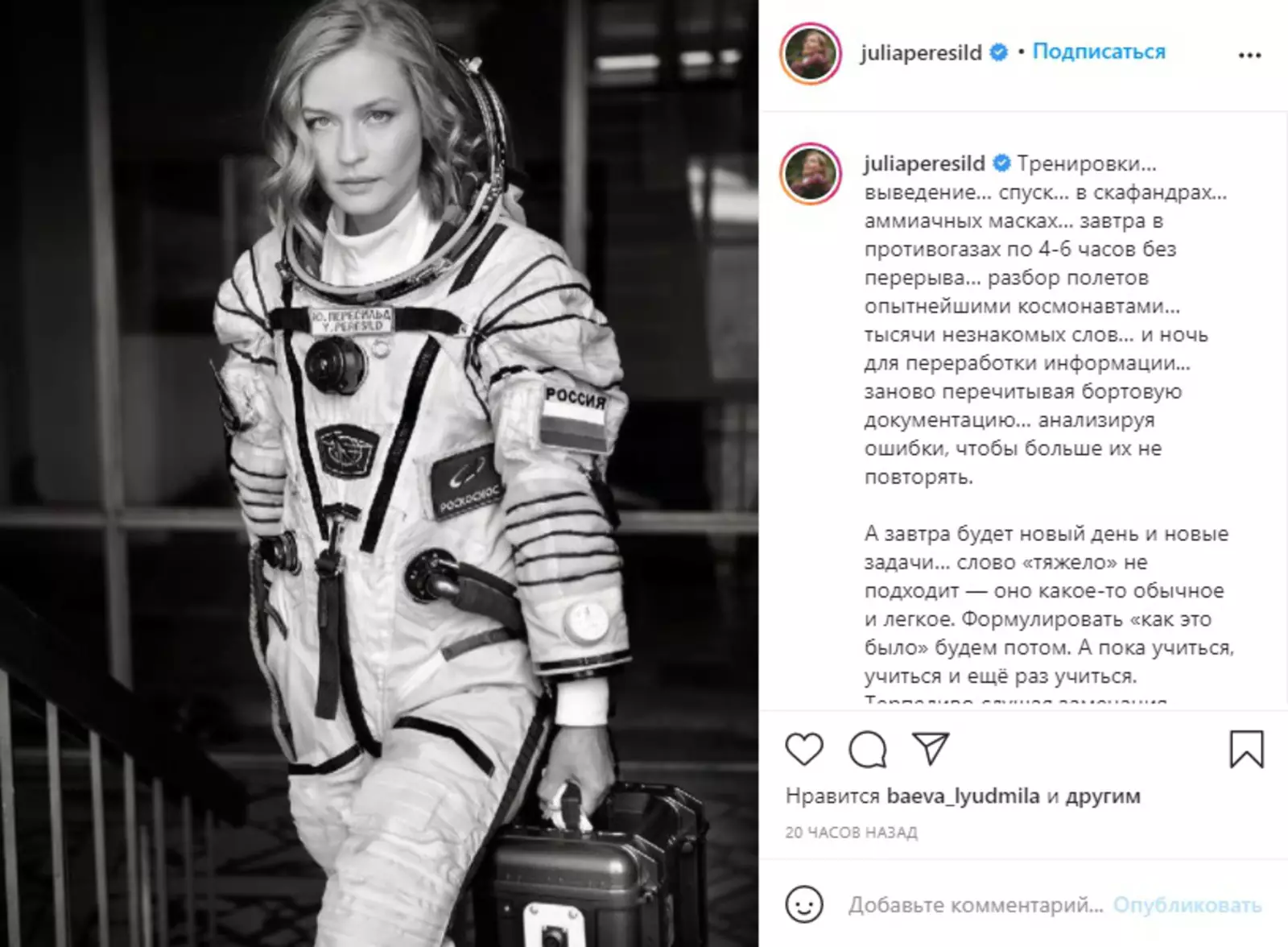 Актриса Юлия Пересильд опубликовала в Instagram пост о том, как готовится к первым в истории отечественного кино космическим съемкам для картины «Вызов».
