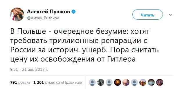 В России высказывания депутатов ПиС прокомментировал в Twitter российский сенатор Алексей Пушков, который в ответ предложил выставить счет за освобождение Польши от нацизма.